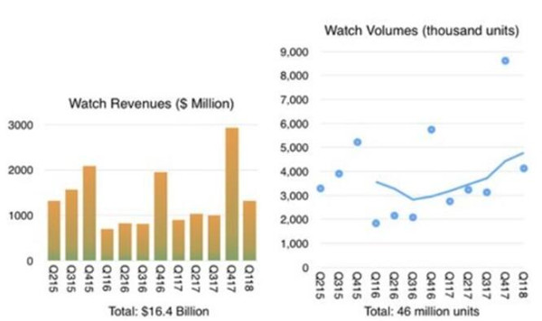 Horace Dediu还做了进一步分析,任务2018年第一季度有苹果Apple Watch的销量约为400万只,与去年同期相比有所增加。按照他的数据,去年同期Apple Watch销量不到300万只。