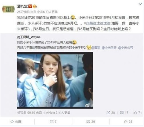 小米产业投资部合伙人潘九堂发微博透露:“小米手环2在2016年6月初发售,按常理推断,小米手环3发售不应该晚过6月吧。”那么可以断定,这款产品最快会在五月份发售开卖。那么,原本说在4月25日与小米6X一起上市却没有上市的小米手环3会在五月跟小米7同时上市吗?还是单独上市小米手环3?又是一个不解之谜。
