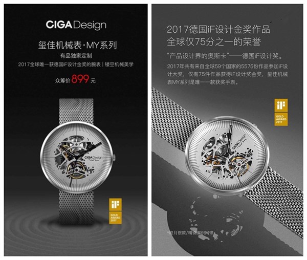 玺佳机械表MY系列提供曜石黑、皎月银两种配色,此次的新款腕表是CIGA Design与小米众筹的二度合作,早在2017年11月30日,CIGA Design首次在小米众筹发布新品,玺佳全镂空机械表众筹首发当日售罄,销售额破四百万人民币。