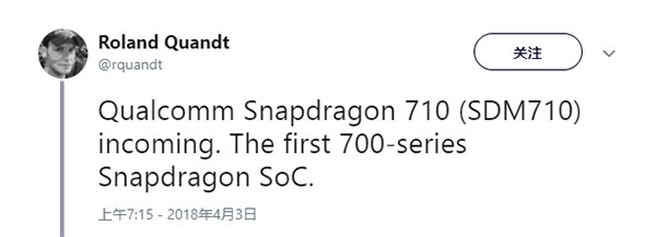 在今年2月份的MWC大会上,高通宣布推出旗下骁龙700系列移动平台。现据爆料达人rquandt称,骁龙700系列首款处理器名为骁龙710,即将推出。