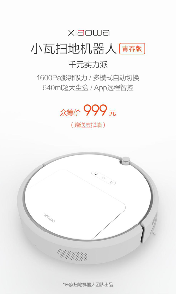 小瓦扫地机器人青春版配备了640ml 超大尘盒容量,可以满足普通家庭一周的垃圾盛放需求,从而降低动手频率;机身内置了2600mAh锂电池,轻松搞定中小户型的单次清扫任务;当完成清扫任务或电量低于30%时,自行启动回充。小瓦扫地机器人青春版的越障能力最高达到了2cm,与目前最高端的石头扫地机器人达到同一水平;连接米家APP可随时远程启动清扫,并实时查看扫地机器人的工作状态,同时你也可以设置定时清扫。小瓦扫地机器人青春版目前已正式上线小米众筹,售价999元。