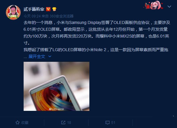 近日微博数码博主爆料称:“去年的一个消息,小米与Samsung Display签署了OLED面板供应协议,主要涉及6.01英寸OLED屏幕。邮政局显示,这批货从去年12月份开始,第一个月发货量约为100万块,次月将再发货220万块。而爆料中小米MIX 2S的屏幕,也是6.01英寸。”