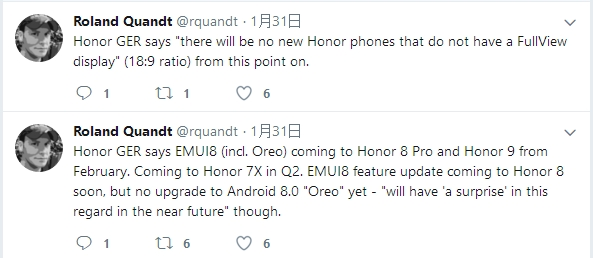 Roland Quandt表示,在和荣耀手机德国方面的工作人员交流后,他了解到,荣耀今后发布的手机都会是FullView Display,按照荣耀总裁赵明对FullView Display的解释,荣耀将不会推出非18:9比例屏幕的手机。也就是说,今年上半年铁定亮相的荣耀10也会采用18:9全面屏设计。