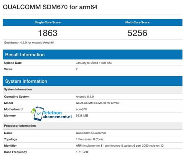 荷兰手机站点telefoonabonnement从Geekbench4上拿到了骁龙670的跑分,截图显示,骁龙670单核1863分,多核5256分,8核心设计,小核主频1.71GHz。