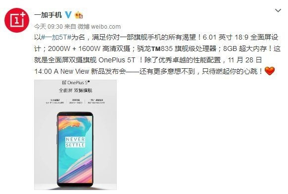 11月28号下午2点,一加5T的国行发布会将在北京举行。此前,一加科技CEO刘作虎在微博上表示,将在发布会上“解释”指纹后置的原因。另外根据官微的说法,发布会上还有更多意想不到的惊喜,不知道除了手机,一加还会带来什么新品。