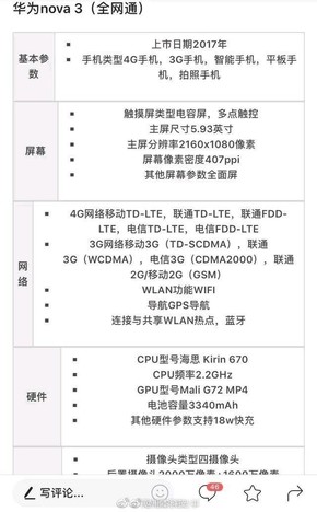 爆料显示,华为nova 3支持全网通,上市时间为2017年,这意味着该机最晚在12月底发布。