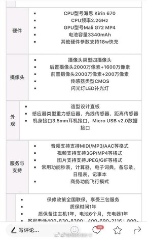 其他配置方面,华为nova 3搭载麒麟670处理器,电池容量为3340mAh,并支持18W快充,机身保留3.5mm耳机孔。