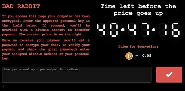 此外“坏兔子”还会显示一个倒计时界面,声称不及时支付的话,其勒索金额就会水涨船高。目前暂不清楚“坏兔子”攻击的幕后主使者身份、受害者都有谁、以及该恶意软件是哪里产生和如何传播的。