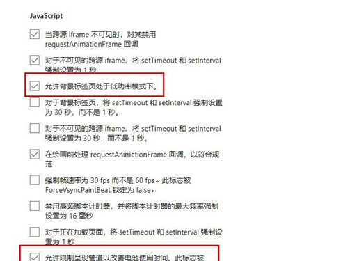3、开启“容许环境标签页处在低功率模式下”和“容许限定展现管路以改善电池使用时间。此标示被forcevsyncpaintbeat 锁住为 false”。