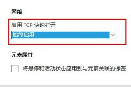 4、下拉至“网络”,将“启用tcp快速打开”设置为“自始至终启用”即可。