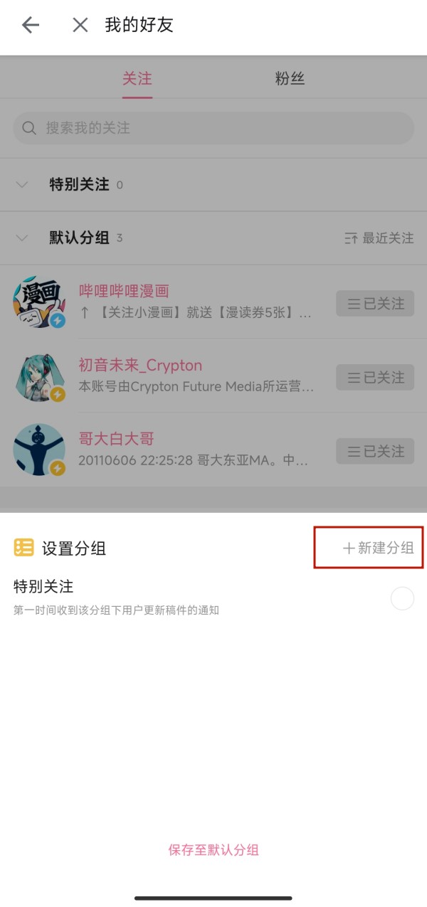 3、点击【新建分组】,创建后,将关注对象移入对应的分组即可。