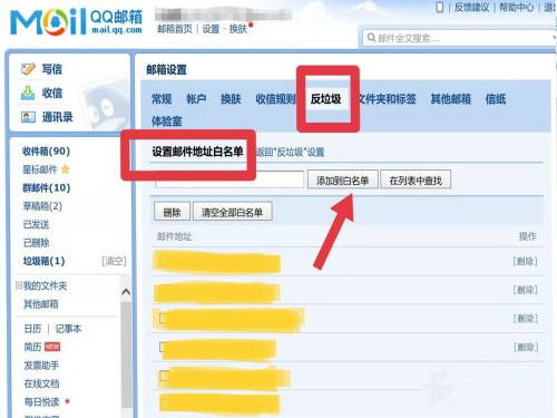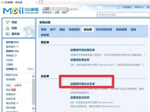 3、返回反垃圾页面,点击设置邮件地址白名单。