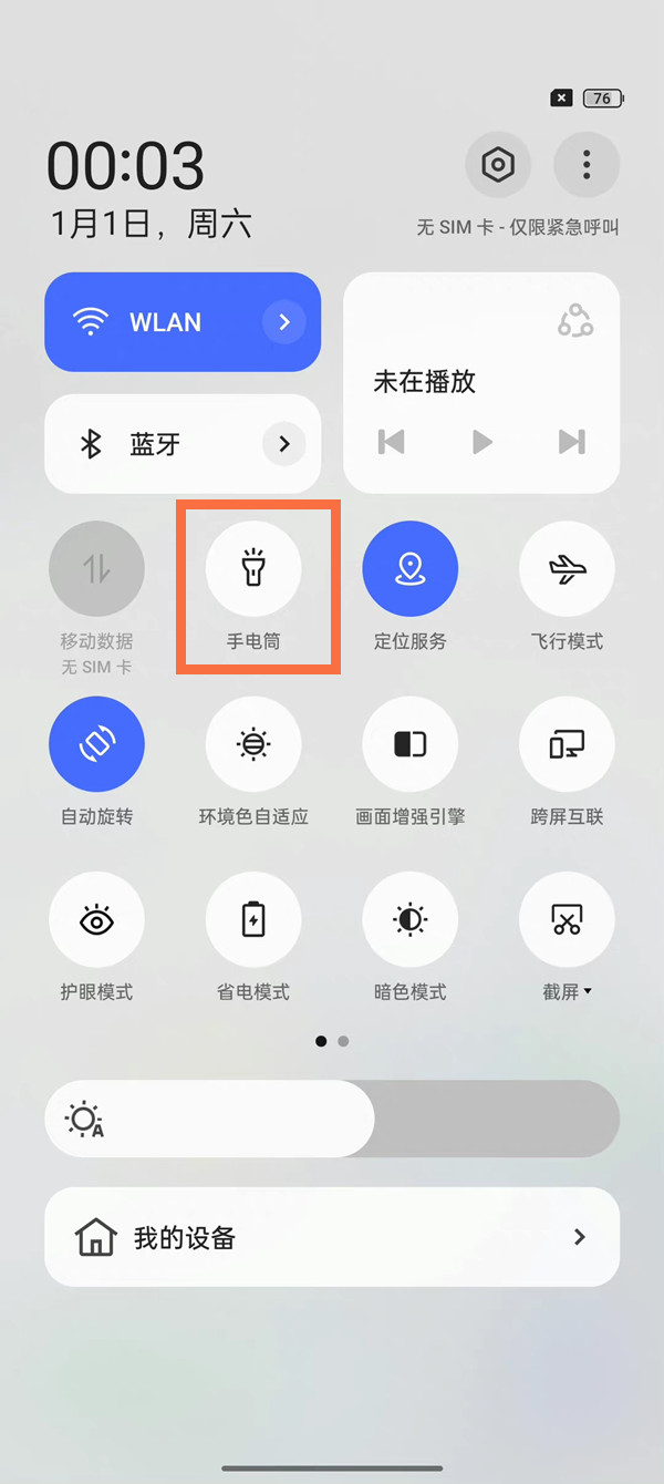 你也可以从屏幕顶端下拉打开控制中心,点击【手电筒】图标。