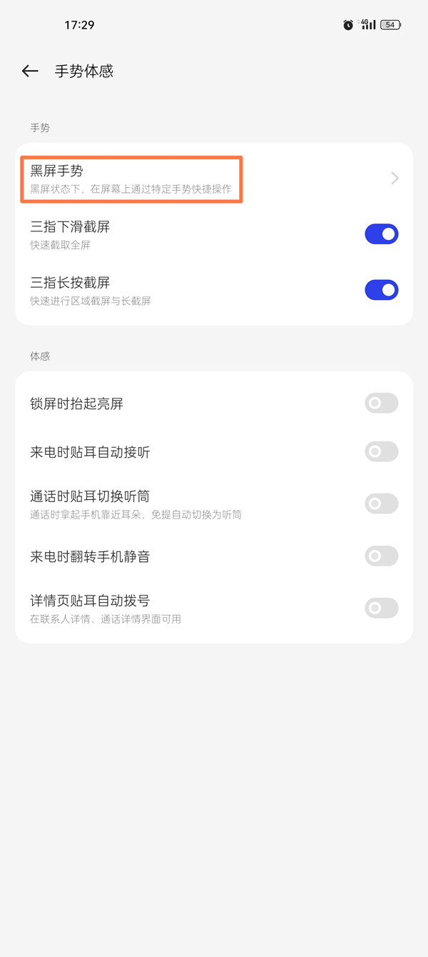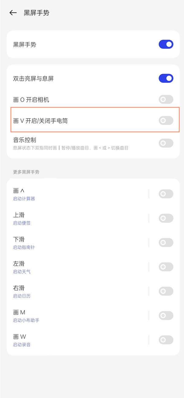 4、打开【画v启动手电筒】的开关,当黑屏时在屏幕画v即可。