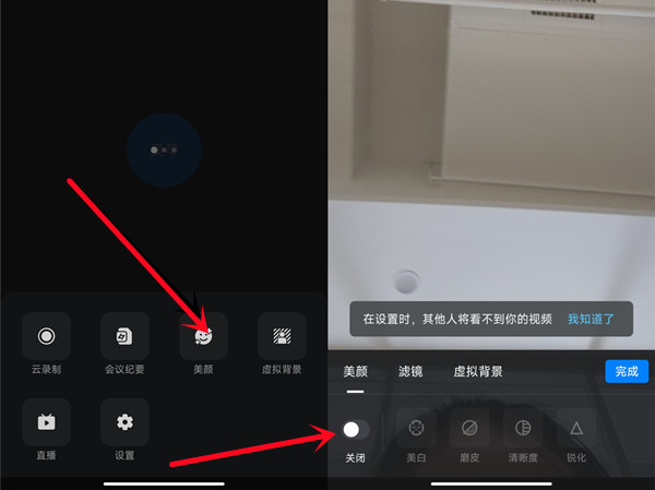 ️钉钉视频会议、钉钉直播开启美颜方法:只需要点击美颜图标开启美颜功能。