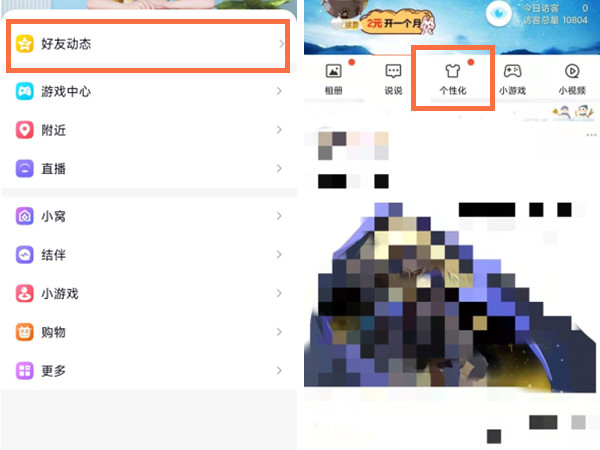 1、打开手机QQ,在动态界面点击好友动态,再点击个性化。