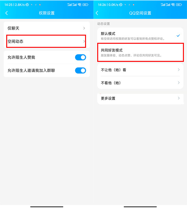 3、点击空间动态,在动态设置一栏下勾选共同好友模式即可。