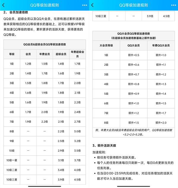 QQ会员、超级会员以及QQ大会员,在原有通过累积活跃天数来获取相应的QQ等级增长的基础上,还可以根据VIP等级来技术QQ等级的增长,累积更多的活跃天数,获得更高的QQ等级。