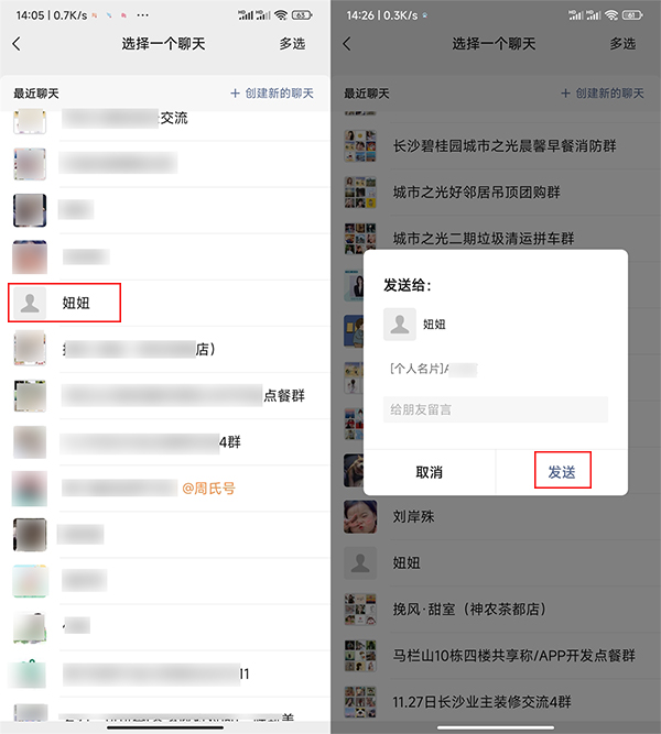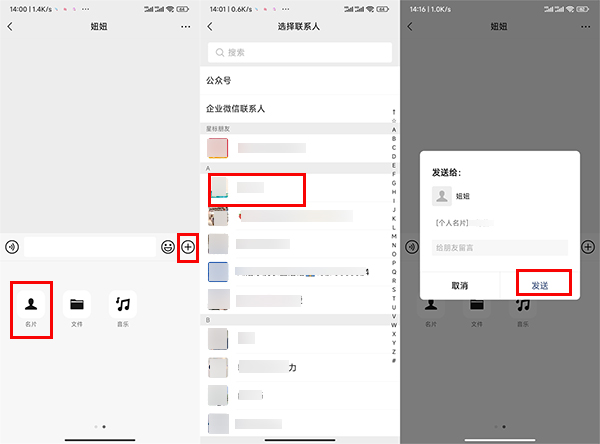 2、点击对话框后的加号,点击名片,选择需要发送的好友名片,点击发送即可。