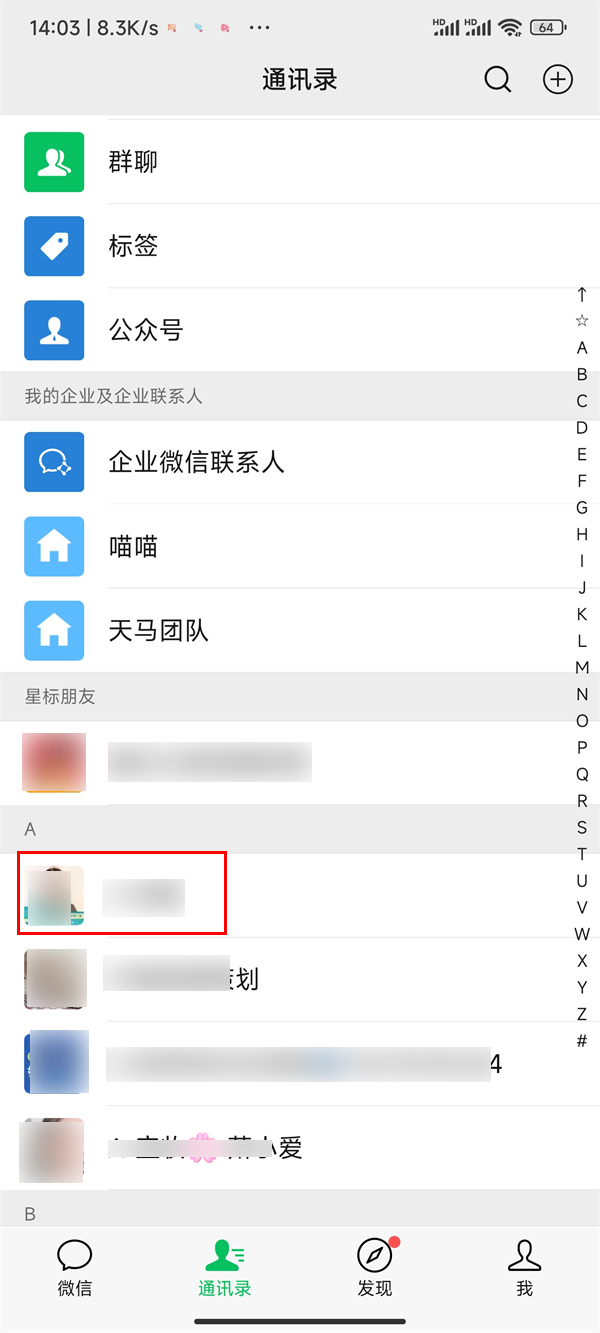 1、打开微信,点击通讯录,选择需要发送名片的好友。