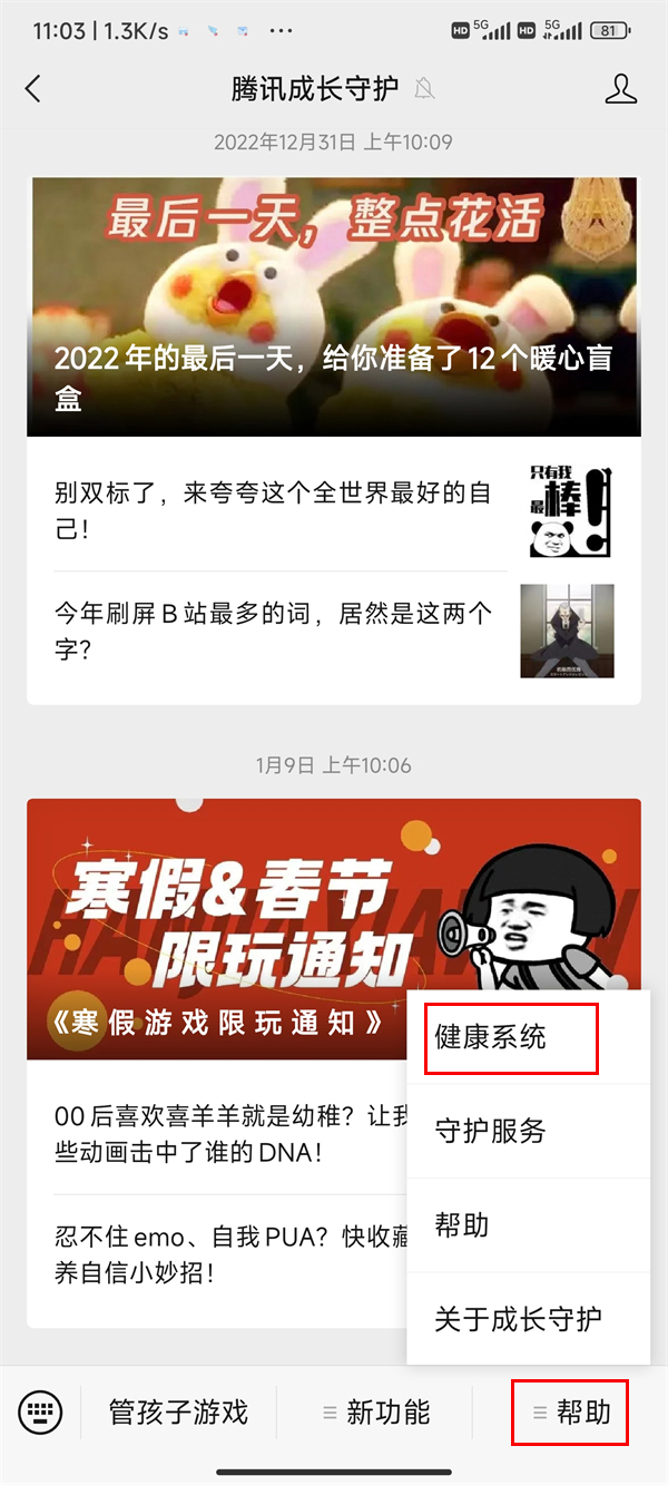 1、打开微信,进入腾讯成长守护公众号,点击帮助,再点击健康系统。