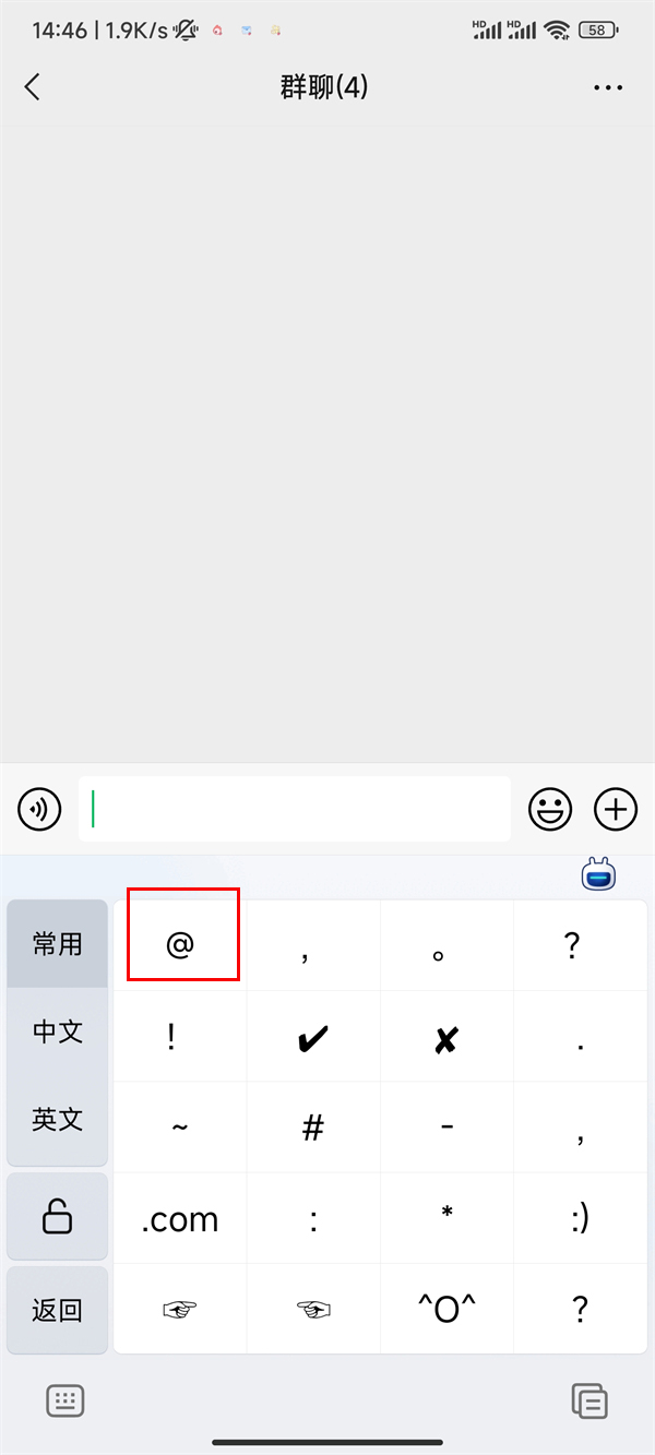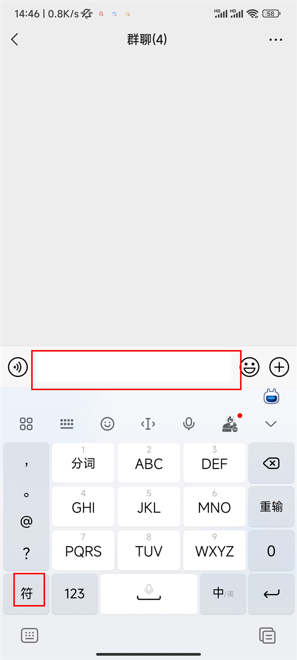 2、点击聊天框,,点击【符】,点击【@】,点击【所有人】即可。
