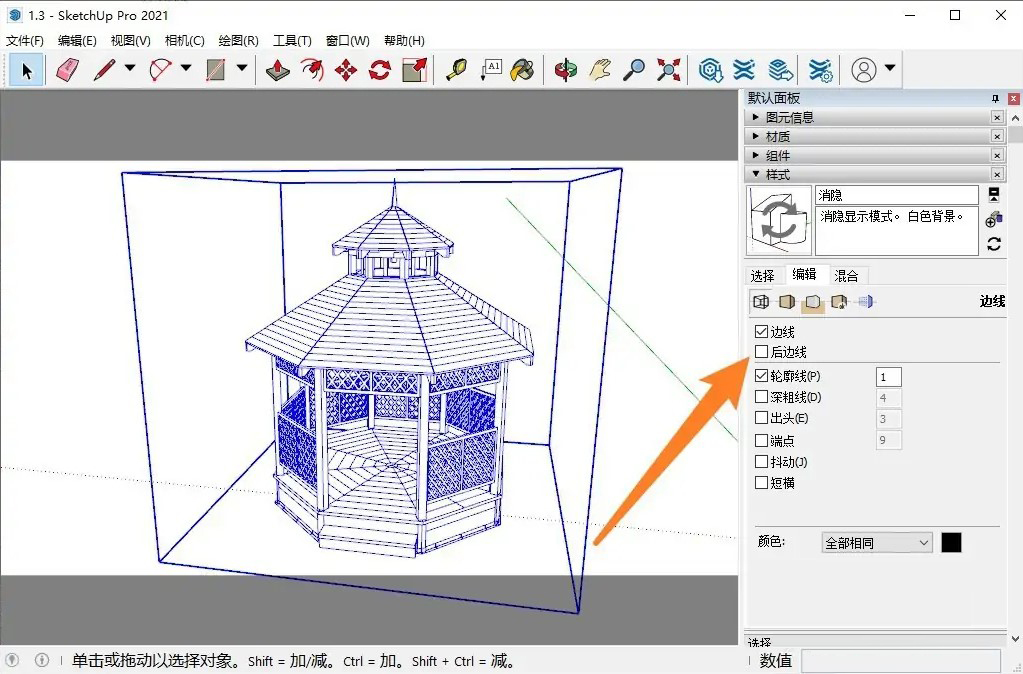 4、进入编辑面板,选择边线,将边线和轮廓线进行勾选,即可调出白模模式。