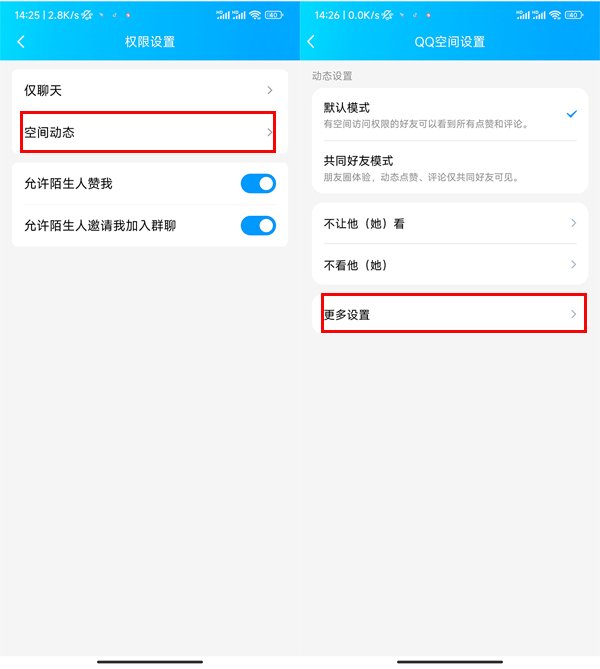 3、点击空间动态,点击更多设置。