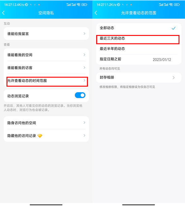 5、点击允许查看动态的时间范围,选择最近三天的动态即可。