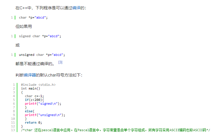 而且关于char还有一个特殊的语言就是char *,它在C/C++中有专门的语义,既不同于signed char *,也不同于unsigned char *,专门用于指以'\0'为结束的字符串。