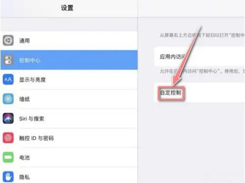 1、点击iPad底部的设置,点击控制中心右侧的自定控制。