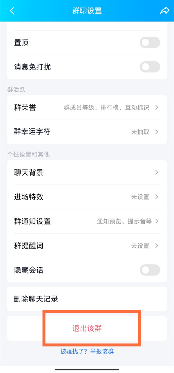2、向上滑动到最底部,点击【退出群聊】即可。