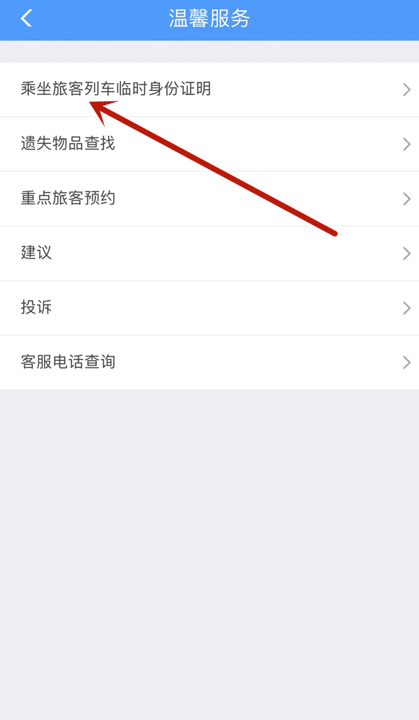 2、在温馨服务页面,点击乘坐旅客列车临时身份证明。
