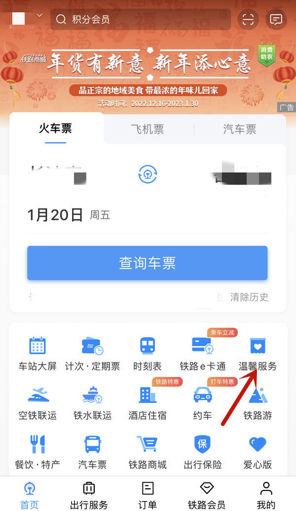 1、打开铁路12306app,点击温馨服务。