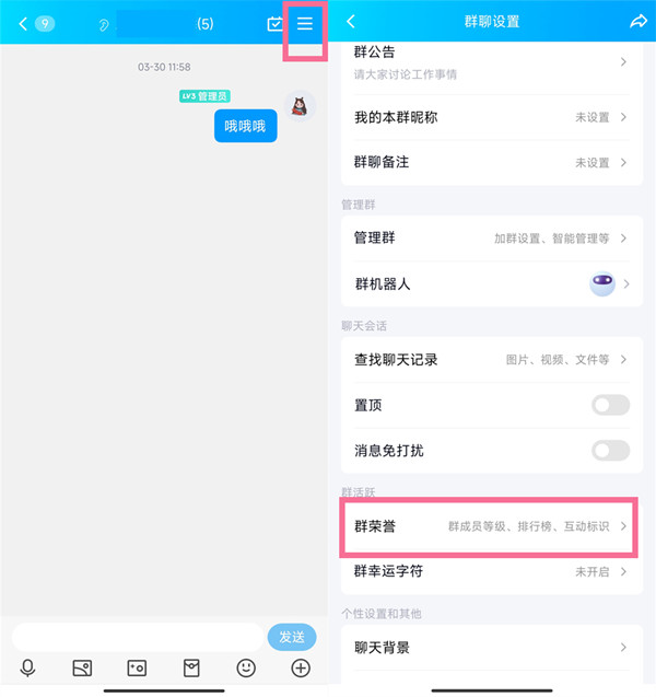 1、打开手机qq,进入群聊页面,点击右上角的三横,选择【群荣誉】。