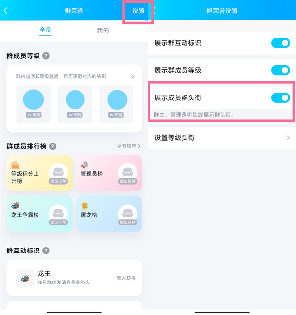 2、点击右上角【设置】,打开【展示成员群头衔】右侧的开关即可。