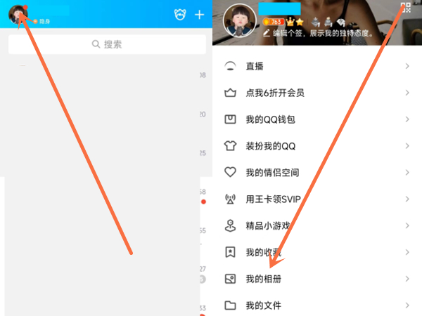 1、打开手机QQ,点击左上角头像,再点击我的相册。