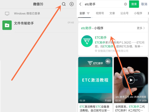 1、打开微信app,点击右上角搜索图标,输入ETC助手进入,点击ETC助手小程序。