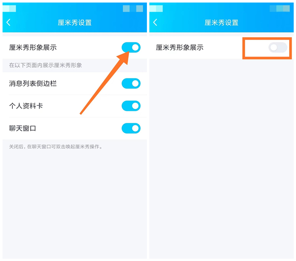 5、点击【厘米秀形象展示】后面的蓝色按钮,变为灰色即为关闭,关闭后在聊天界面就不会有小人了。