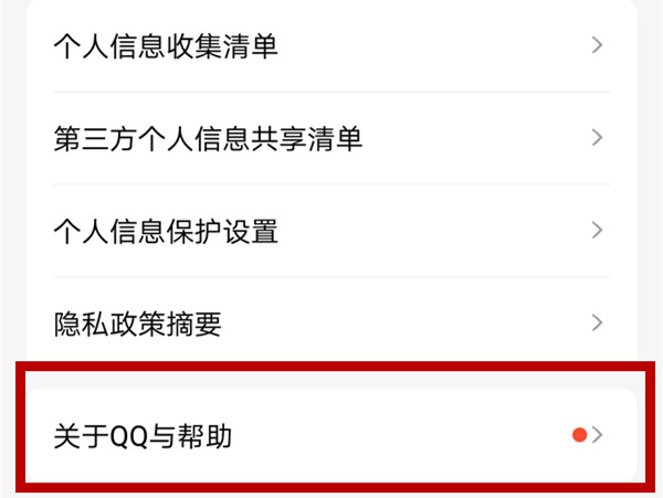 2、在设置界面,点击【关于QQ与帮助】。