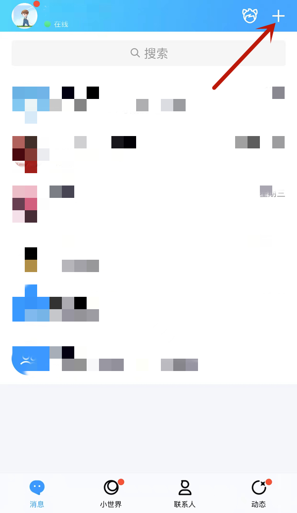 1、在手机qq消息界面,点击右上角【+】图标。