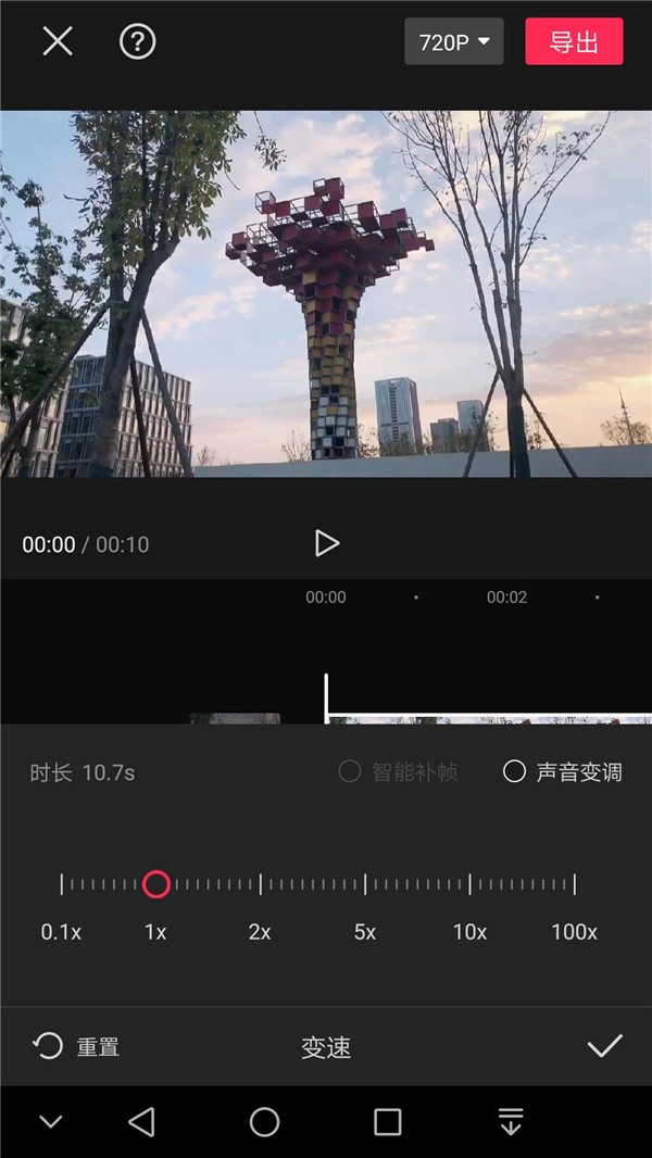 2、上传视频后,点击下方视频条,点击底部【变速】图标