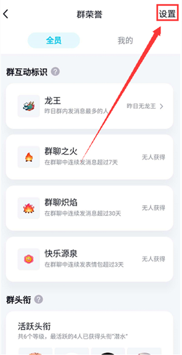 4、在群荣誉页面,点击右上角的【设置】图标。