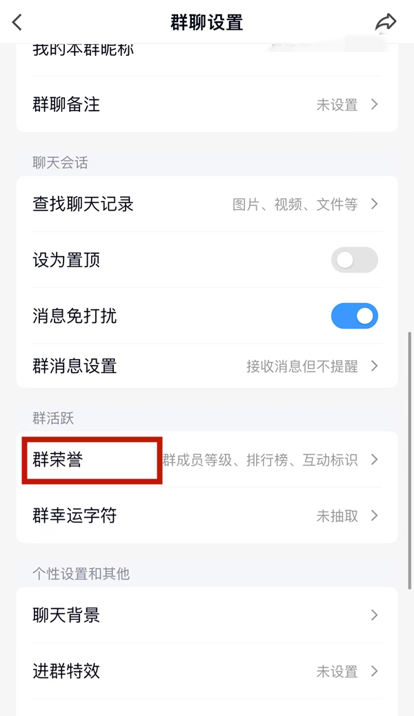 3、在群聊设置页面,往下拉找到并点击【群荣誉】。