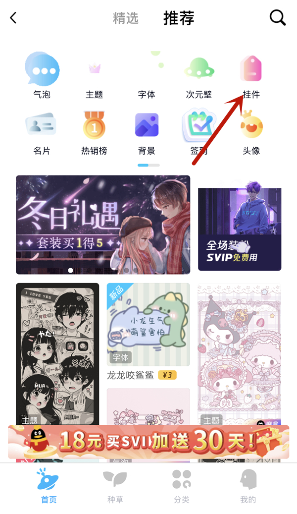 4、在搜索框内搜索默认挂件进行装扮,或往下翻找限免挂件。