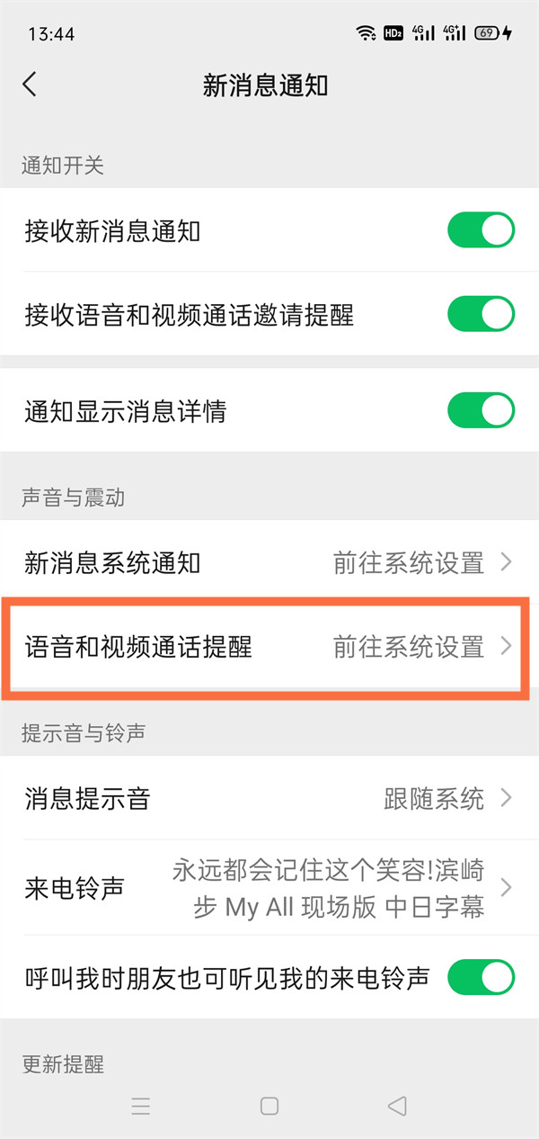 3、点击【语音和视频通话提醒】,关闭振动开关即可。