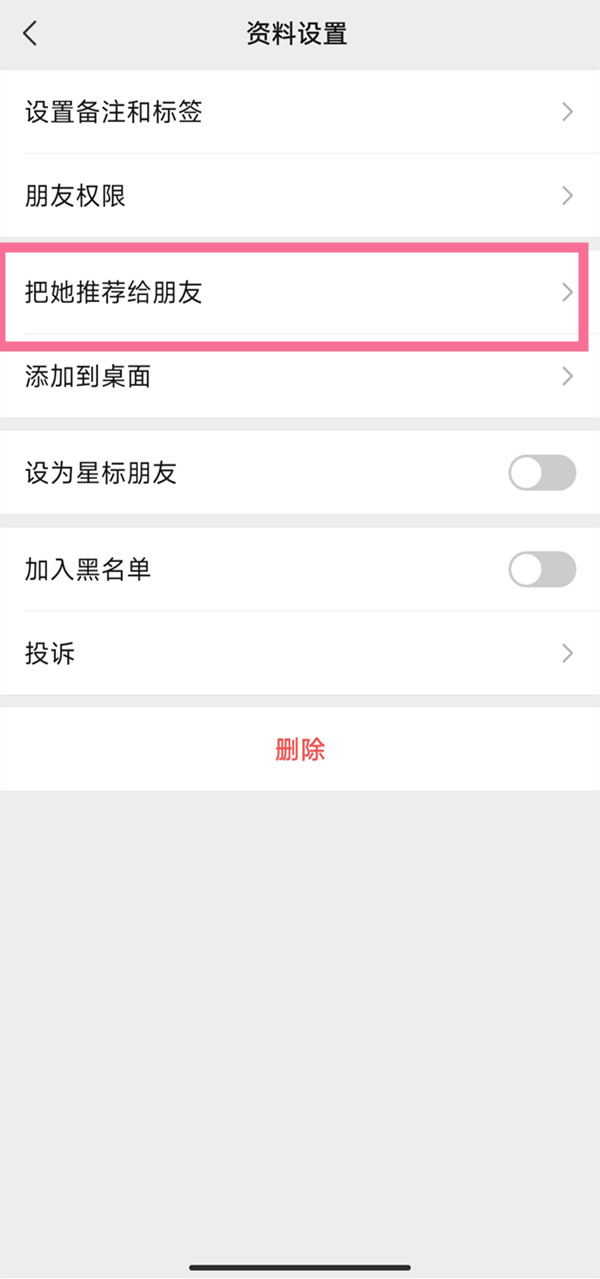 2、点击【把他/她推荐给朋友】,选中需要推送的对象即可。