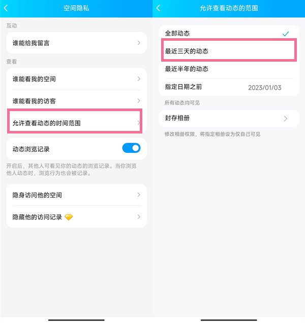 4、点击允许查看动态的时间范围,选择【最近三天的动态】即可。