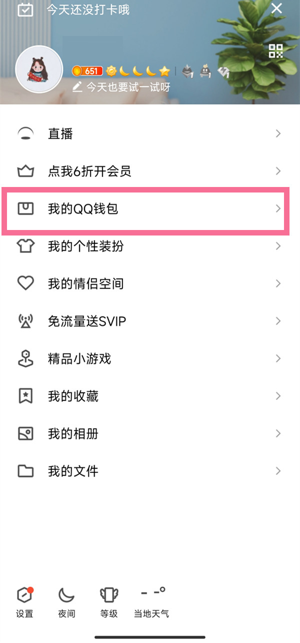 1、打开手机QQ,点击消息页面的个人头像,点击【我的QQ钱包】。