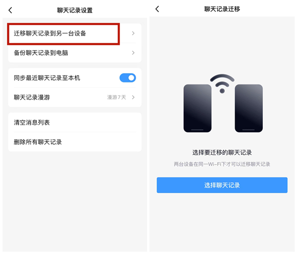 4、点击上方的“迁移聊天记录到另一台设备”,需要两台手机都连接同一个 wifi ,选择要转移的聊天记录即可。